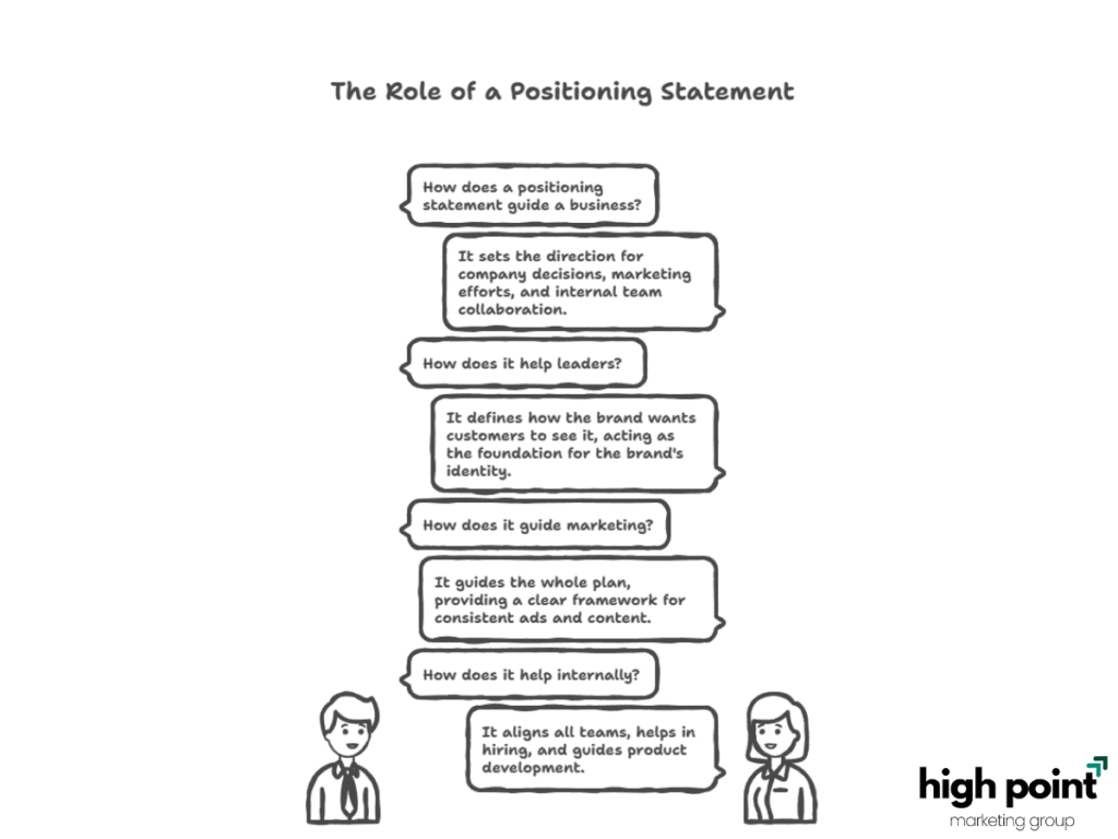 A positioning statement is a guide for a business that sets the direction for company decisions, marketing efforts, and how internal teams work together. It acts as the foundation for the brand’s identity and helps leaders make key decisions by defining how the brand wants customers to see it. For marketing, the statement guides the whole plan, providing a clear framework for creating consistent ads and content that connect with the right customers. Internally, it aligns all teams, helps in hiring the right people, and guides the development of new products and services.