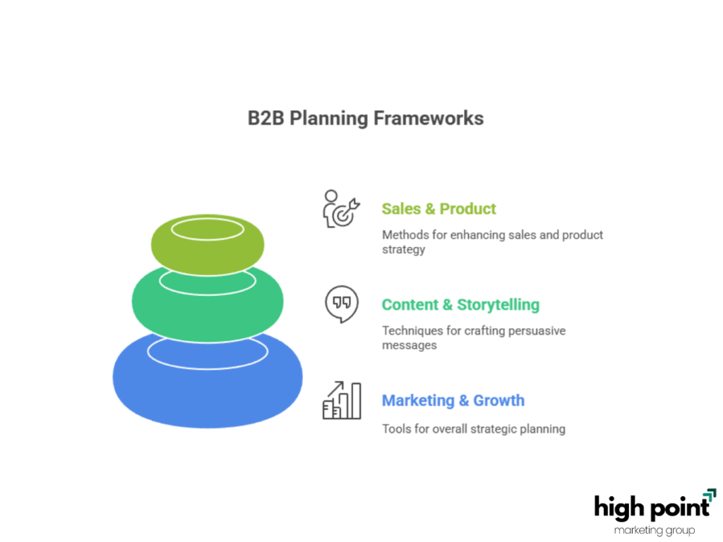 To build a B2B plan, you can use different types of frameworks. They usually fall into three groups: Marketing and Growth for overall planning, Content and Storytelling for writing good messages, and Sales and Product for helping with sales and products.