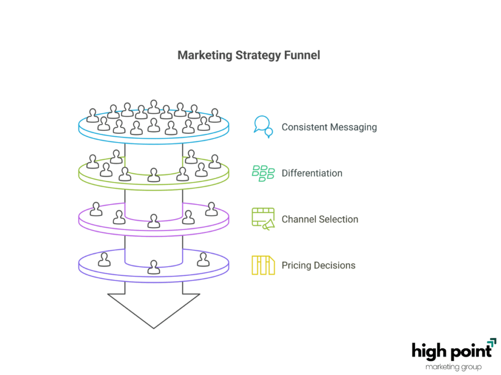 The strategy also directs which marketing actions to take. It helps in choosing the right channels, like social media, and guides decisions on pricing. The main goal of these actions is to influence how customers see the brand, build their preference, and show the brand’s value.