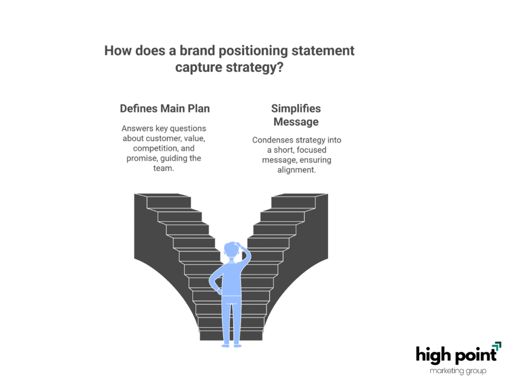 A brand positioning statement captures your strategy by first defining the main plan. It answers key questions about your business, including: Who is your customer? What is your unique value? How are you different from competitors? And what is your brand’s promise? By clearly stating these points, the statement acts as a guide for your team, like a “north star” or a map that gives direction for marketing and messaging decisions.
