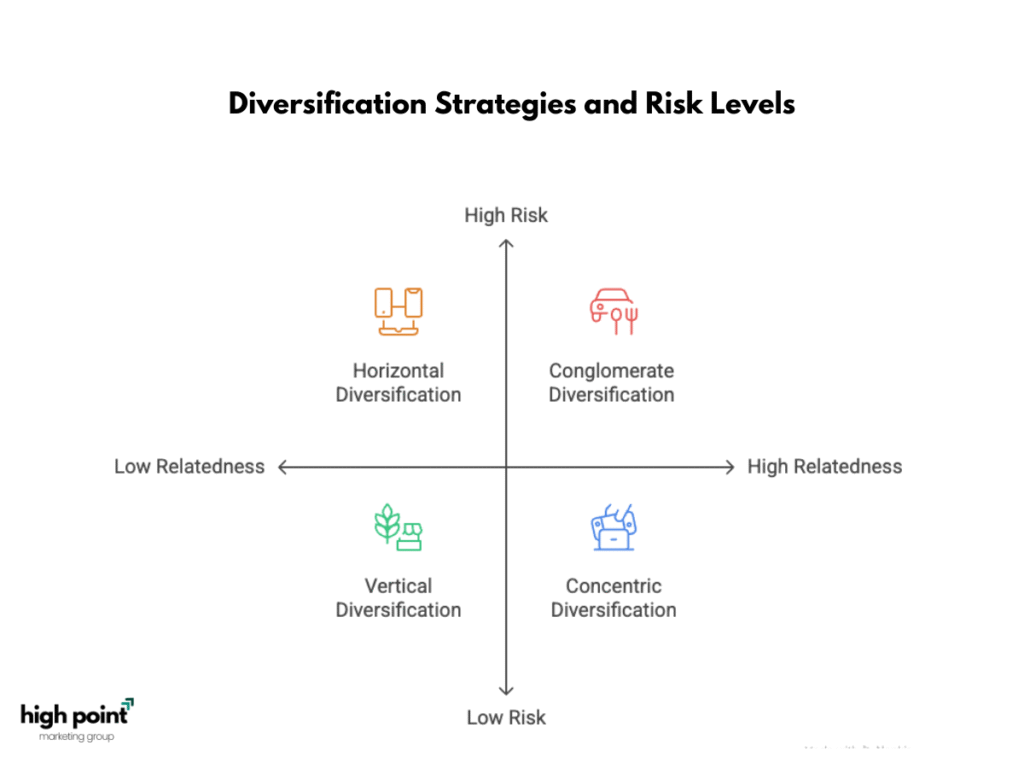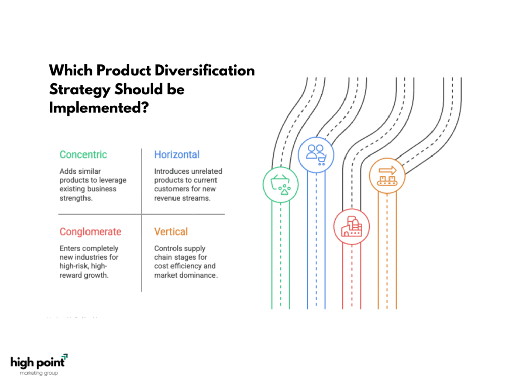 There are several types of product diversification strategies, with four primary methods being concentric, horizontal, conglomerate, and vertical diversification.